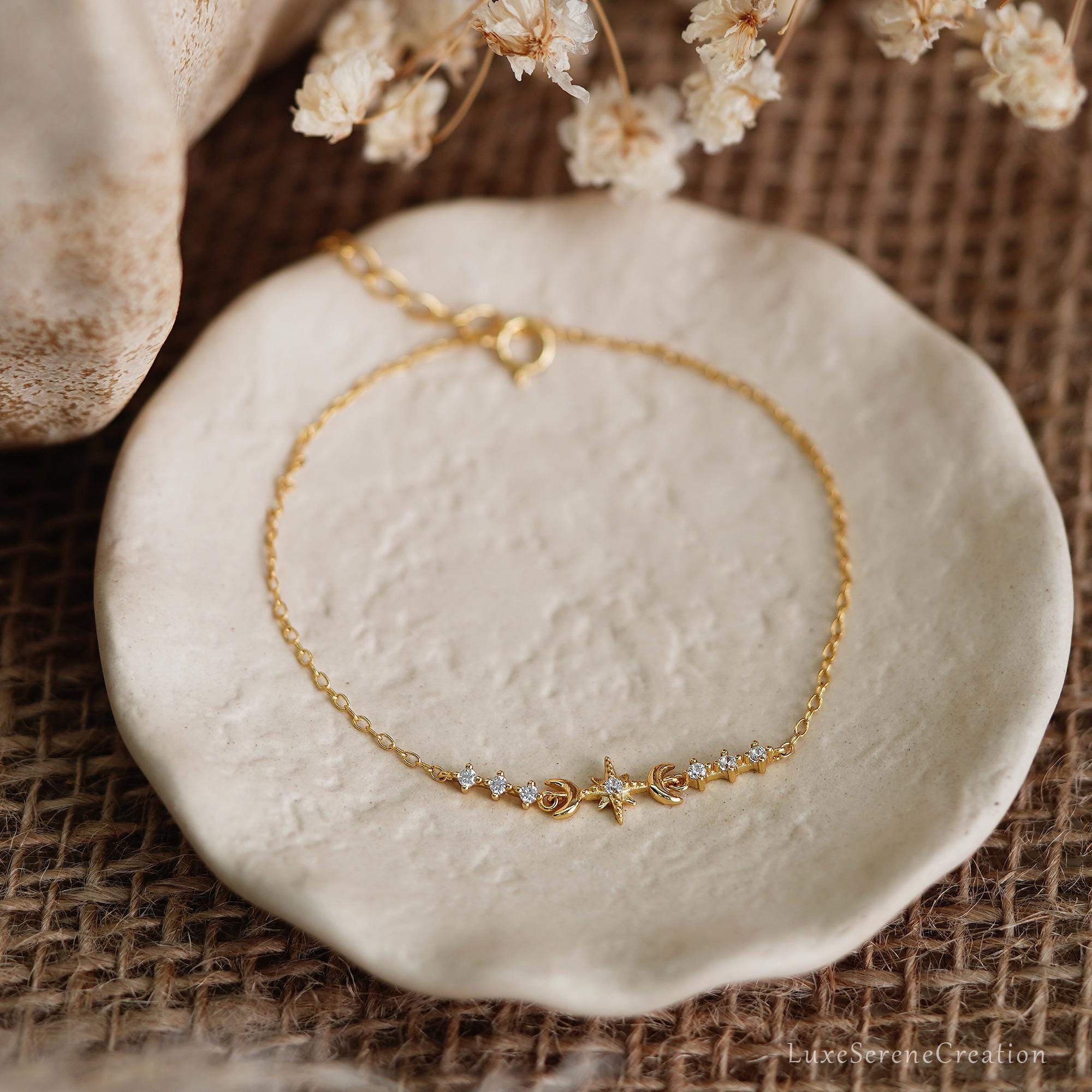 Minimalis Octagonal Star Moon Diamonds Bracelet, 925 Sterling Silver Star Bracelet, Gold Bracelet for Women, Bridesmaid Gift, Christmas Gift